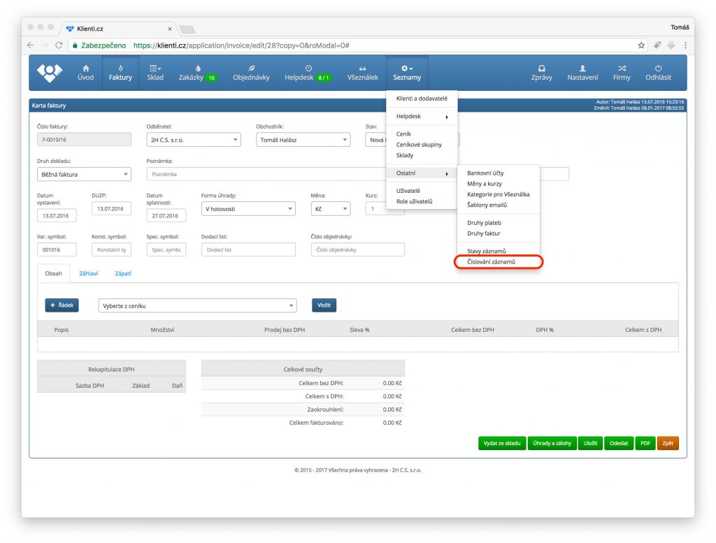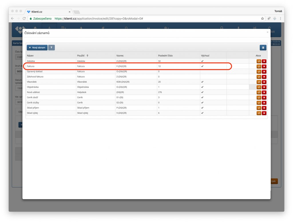 Každý doklad, který v systému klienti.cz vytvoříte má přiděleno své číselné označení. Jde například nejen o číslo faktury, číslo zakázky nebo číslo příjemky, ale také o kód položky ceníku. Po registraci jsou nastaveny výchozí číselné řady, které si však můžete upravit tak aby číslování odpovídalo vašim zvyklostem a potřebám.