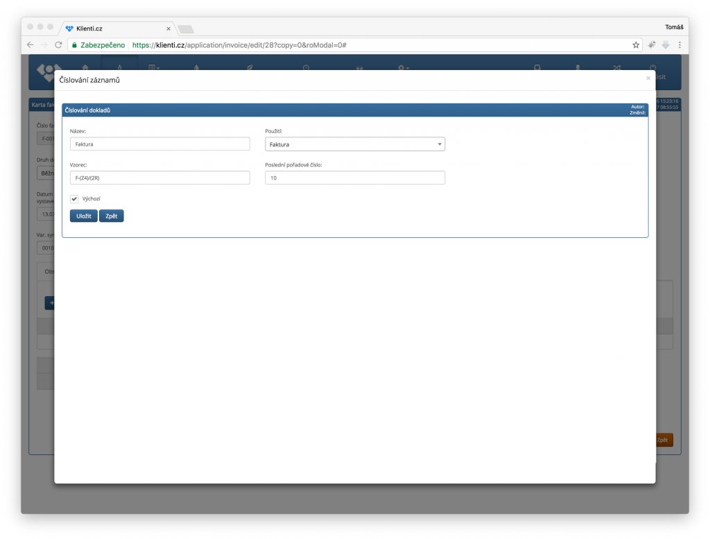 V poli "Poslední pořadové číslo" pak můžete nastavit od jakého pořadového čísla má číslování pokračovat. Když bude vzorec např. F-(Z4)/(2R) a poslední pořadové číslo bude 115 tak nově vytvořený doklad bude mít číslo "F-0115/17".