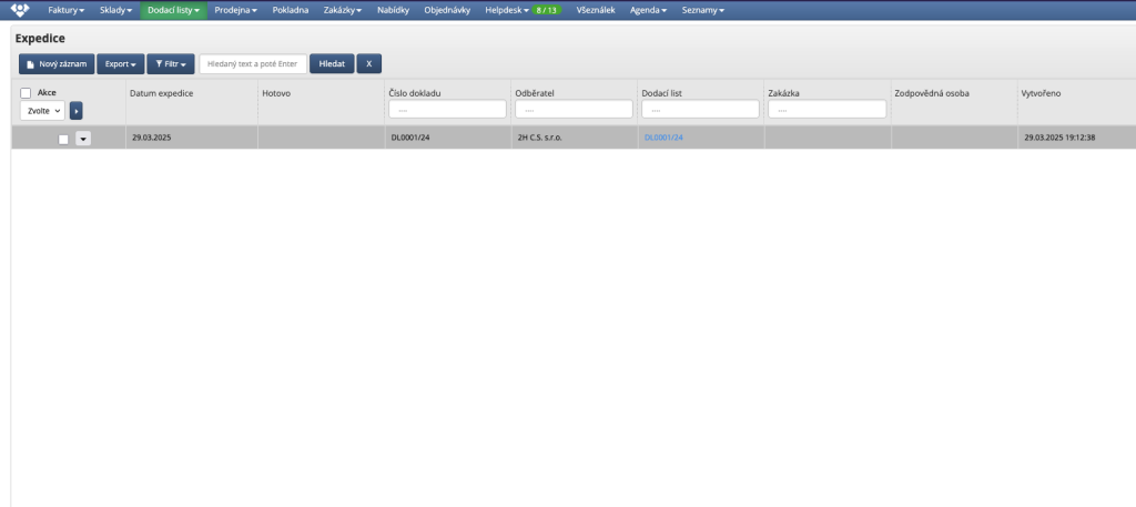 V modulu expedice je vidět seznam všech příkazů k expedici. Pokud již byla expedice dokončena, má doklad příznak "Hotovo".