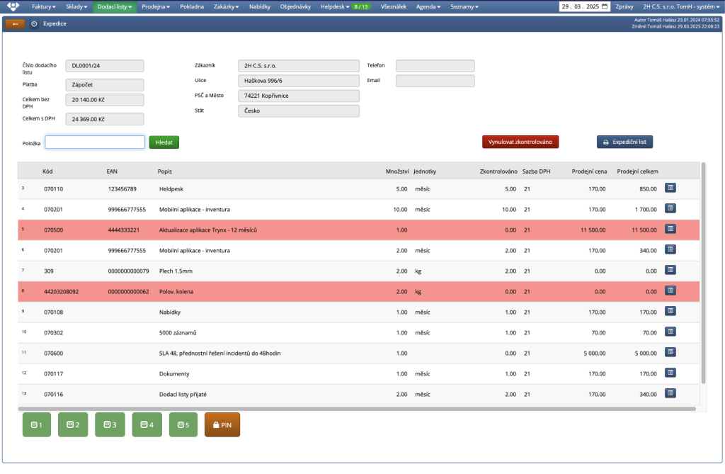 Položky, které ještě nejsou zkontrolovány, jsou zvýrazněny červeným podkladem.
