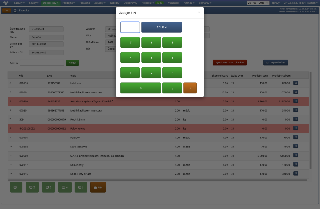 Kliknutím na toto tlačítko můžete po zadání PINu odemknout záznamy expedičního dokladu pro editaci a je pak možné zadat zkontrolované množství ručně. Také je po zadání PINu možné expediční doklad ukončit jakoby byly všechny položky zkontrolovány.