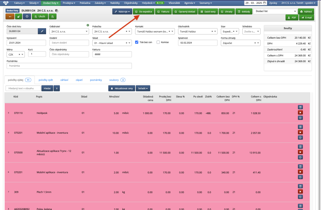 Po dokončení expedice se doklad přepne automaticky do stavu "Expedováno"