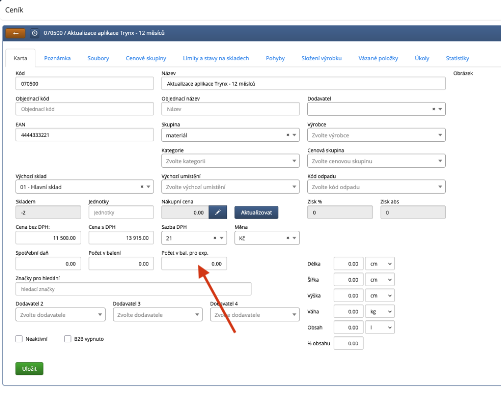 Můžete také vyplnit pole "EAN balení", pokud bude tento EAN vyplněn, bude při naskenování tohoto EANu mobilní aplikací zkontrolované množství rovné hodnotě zadané v "počet v balení". Při naskenování běžného EANu položky bude zkontrolované množství navýšeno o 1.