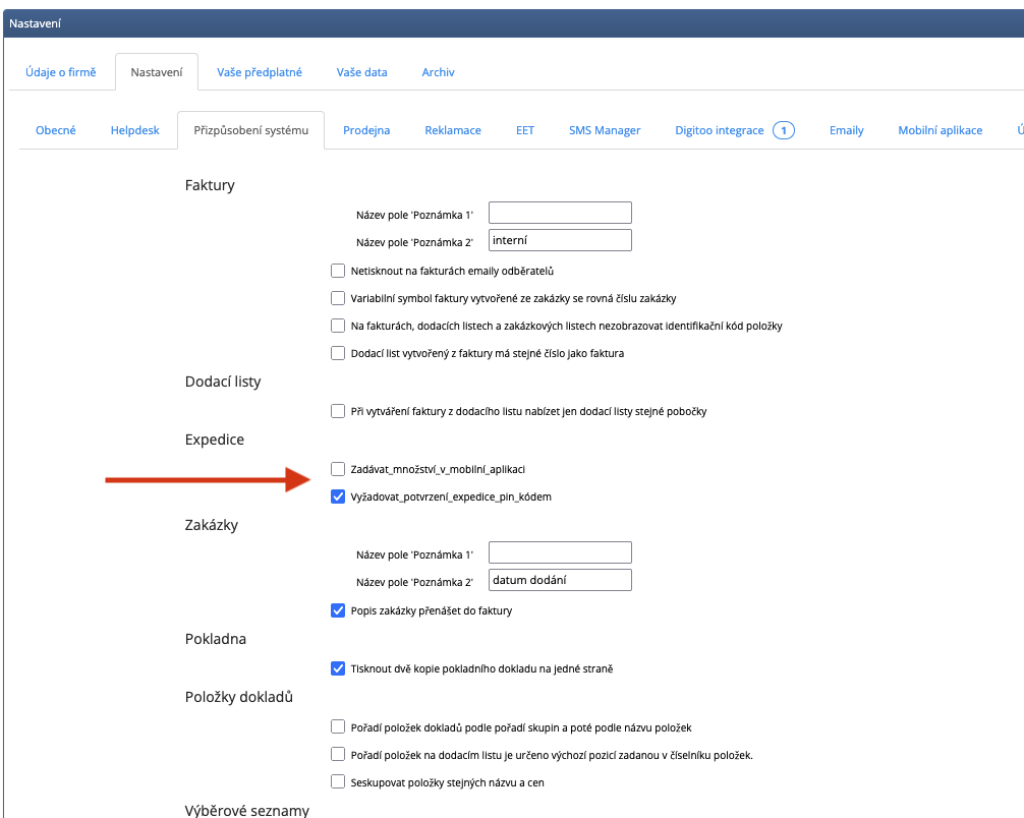 Dále je zde možno nastavit zda mobilní aplikace vyžaduje zadání množství po každé naskenované položce.. Je to volba "Zadávat množství v mobilní aplikaci" v "Nastavení -> Nastavení -> Přizpůsobení systému" . Pokud je zakliknuta, tak je v mobilní aplikaci po každém naskenování kódu (nebo po jeho ručním zadání) vyžadováno zadání množství. Pokud není volba zakliknuta, chová se aplikace tak jakoby uživatel zadal 1. Dále je prováděno násobení hodnotou "Počet v balení pro expedici" z karty položky, pokud je vyplněna.