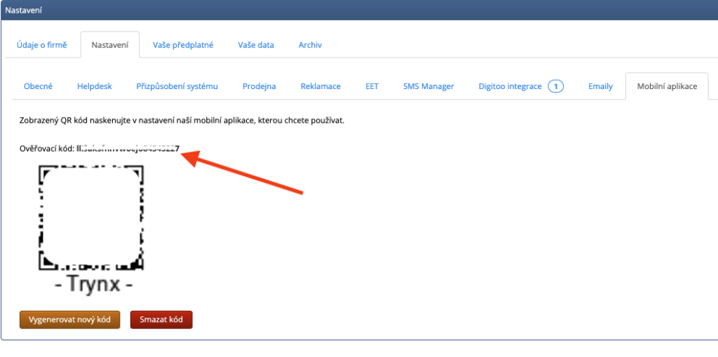 Pokud zde kód nevidíte, klikněte na "Vygenerovat nový kód". Pozor! Vygenerováním nového kódu zrušite přístup mobilům, které jste již dříve nastavili pro práci.