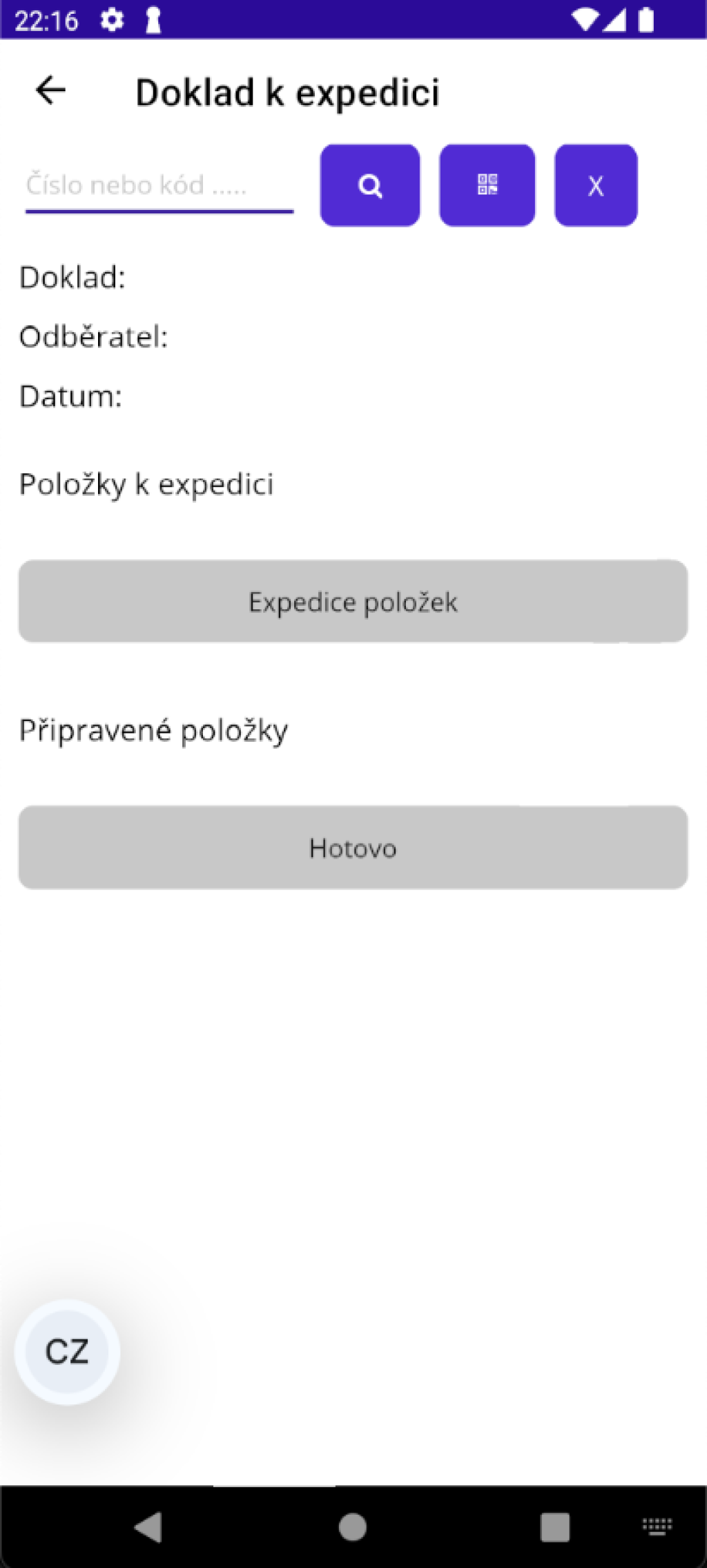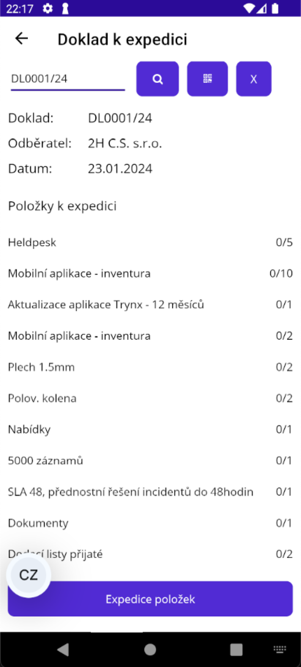 Zde můžete zadat ručně, nebo kamerou naskenovat, číslo dodacího nebo zakázkového listu. Po zadání čísla dokladu ťukněte na tlačítko s lupou. Program se pokusí najít doklad se zadaným číslem. Pokud jej najde, ukáže jeho obsah. Aby mohl být doklad nalezen, musí být k němu být vytvořen expediční doklad (tlačítkem "Do expedice" například z dodacího listu) a dokladu musí být ve stavu "Expedice" (to se stane automaticky po kliknutí na tlačítko "Do expedice").