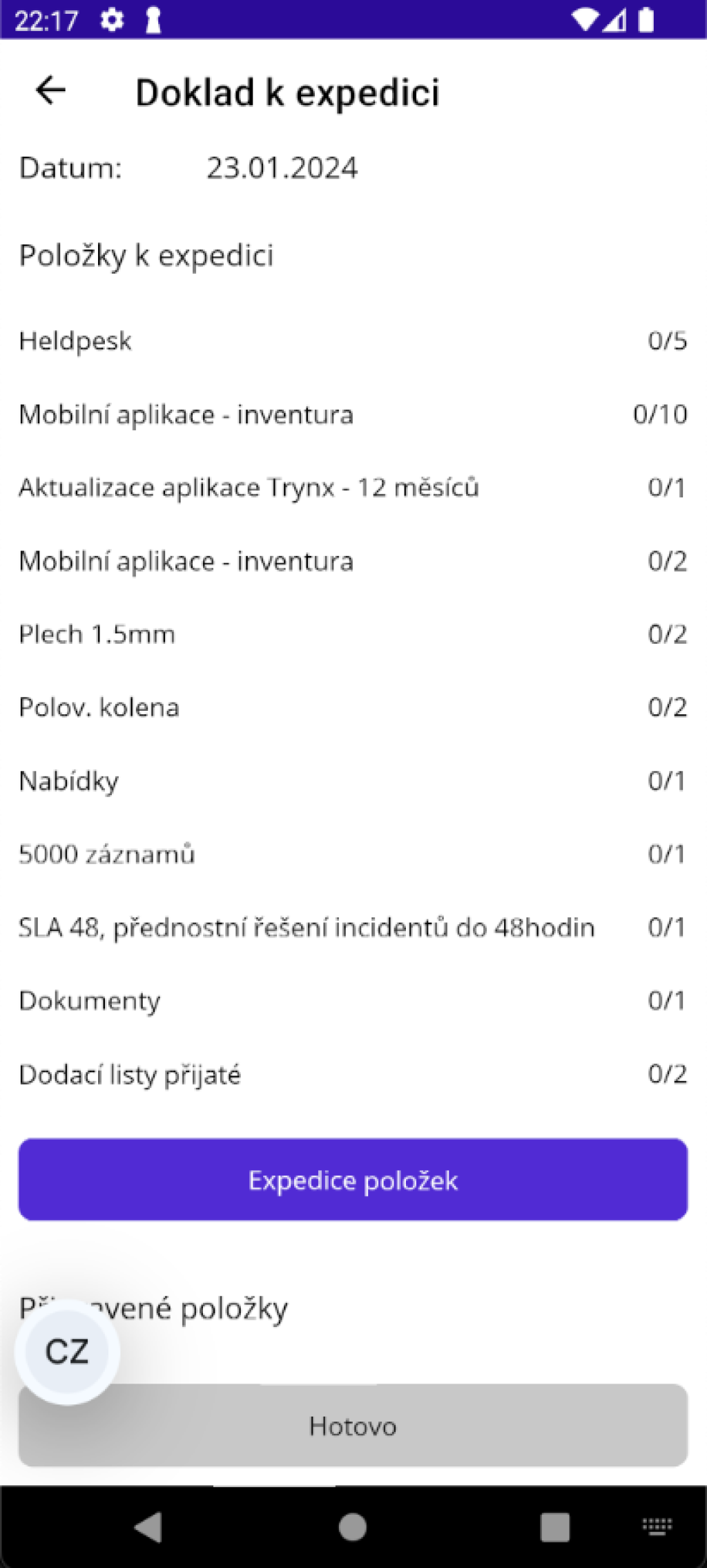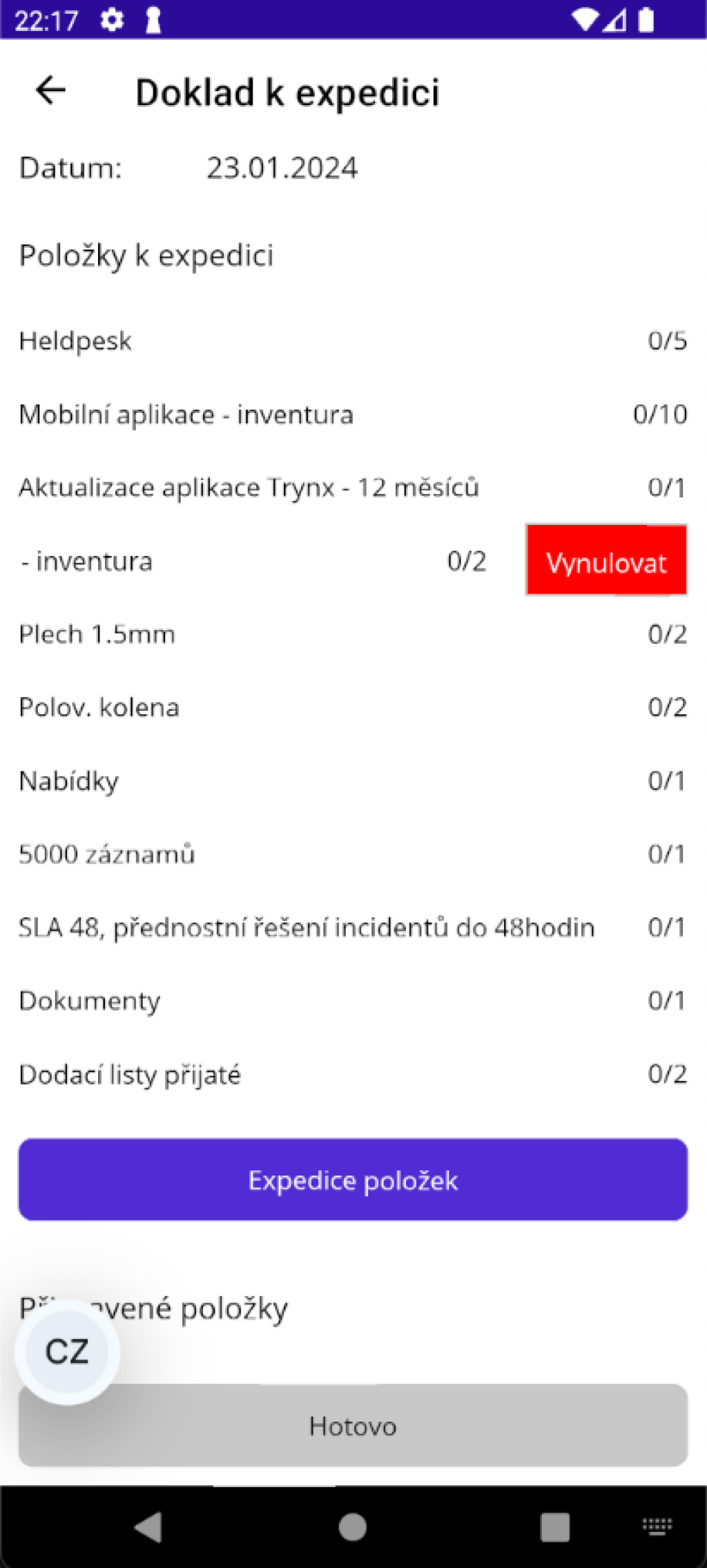 Jakmile jsou všechny položky zkontrolovány, můžete kliknutím na tlačítko "Hotovo" expedici dokladu ukončit.