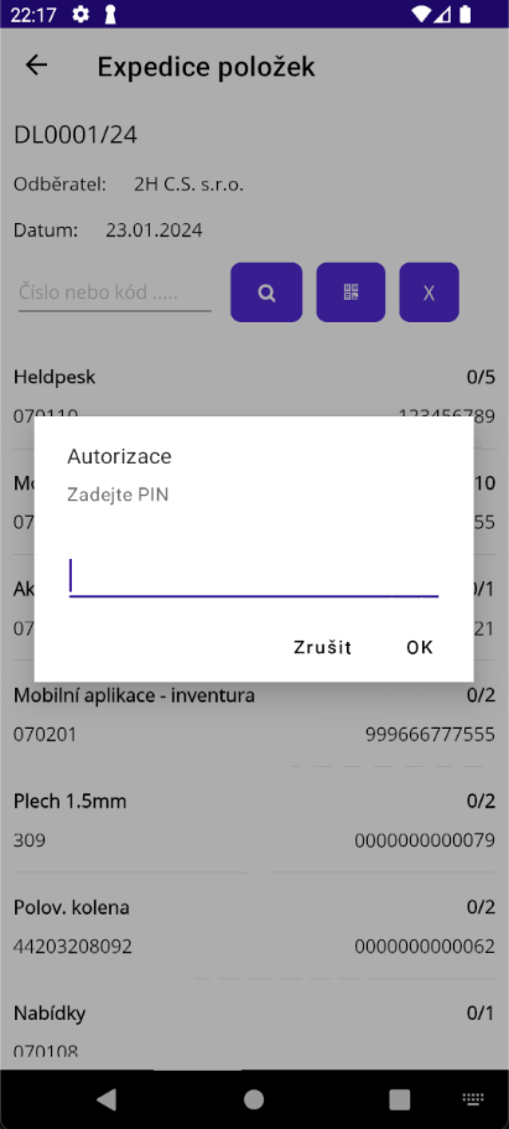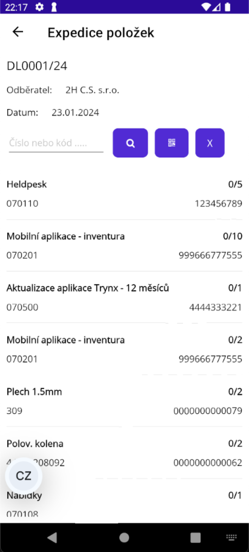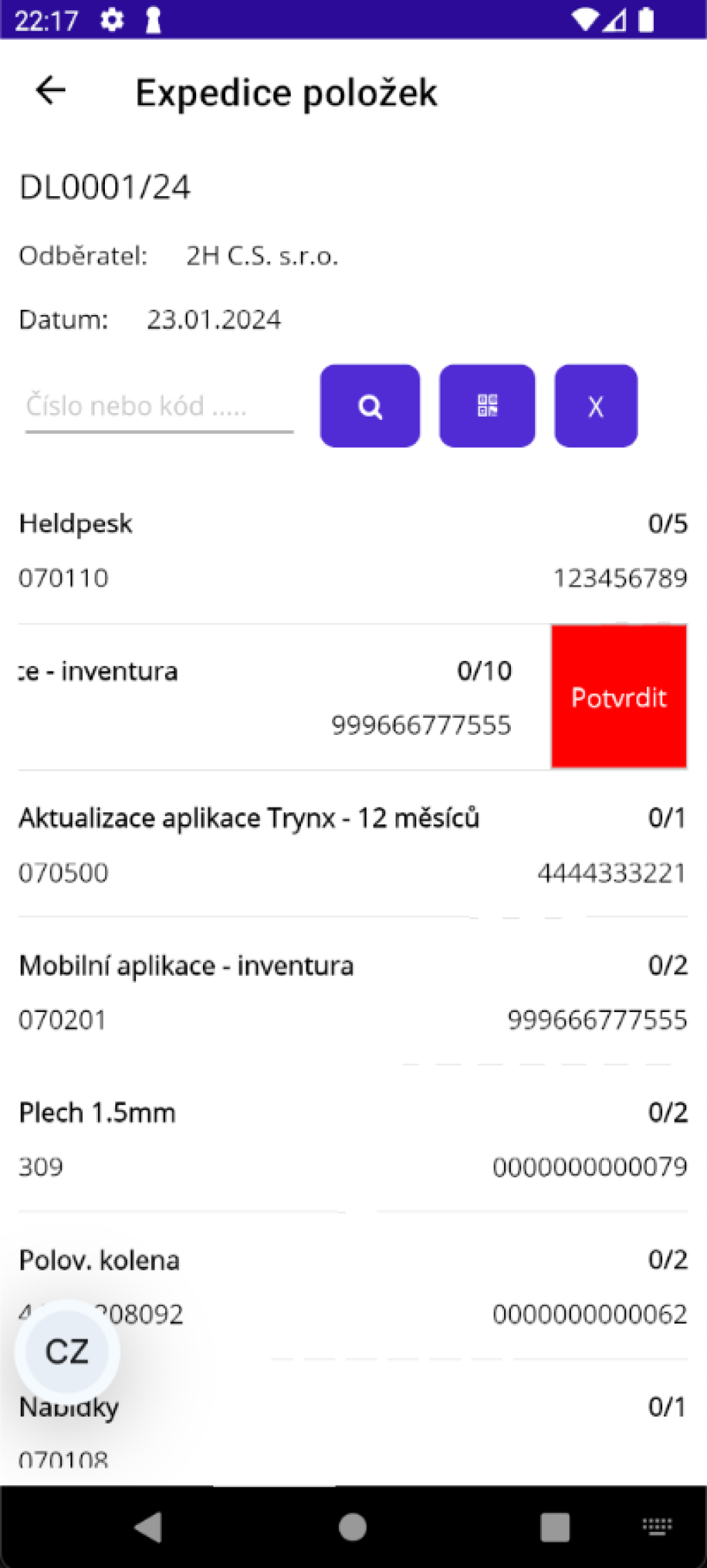 Ťuknutím na tlačítko "Expedice položek" se otevře stránka, na které probíhá kontrola jednotlivých položek. Zde do pole "Číslo nebo kód..." skenujete EAN položky, nebo můžete zadat její identifikační číslo. Po zadání čísla a ťuknutí na tlačítko s lupou se provede vyhledání kódu, pokud je položka v dokladu nalezena, navýší se zkontrolovaný počet o 1, nebo pokud má položka nastaveno na své kartě nějakou hodnotu v poli "Počet v balení pro expedici", bude počet navýšen o toto množství.
