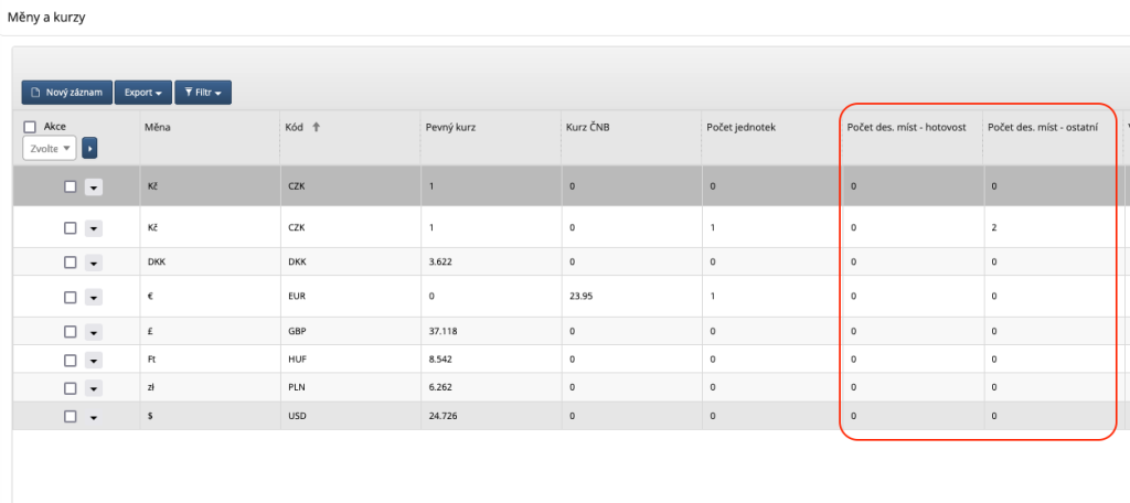 Nastavení počtu desetinných míst se provádí v menu "seznamy -> ostatní -> měny a kurzy"