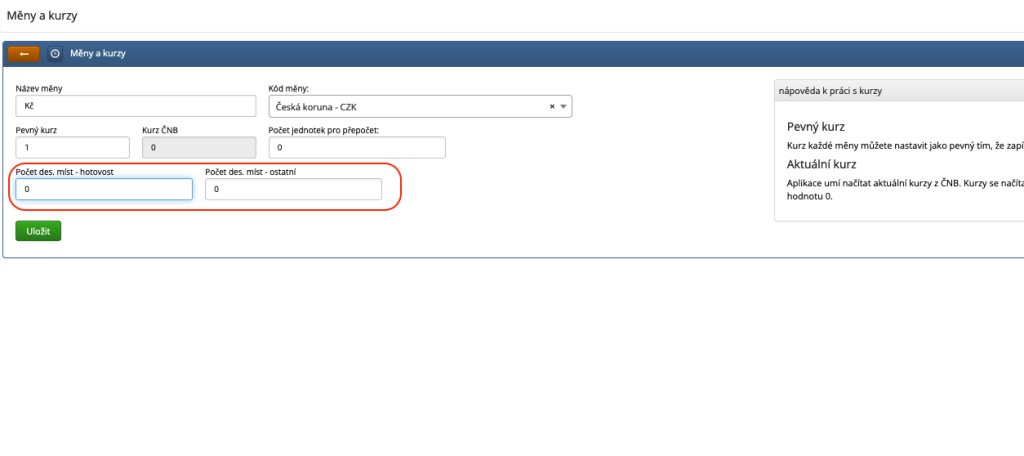 Pokud tedy chcete mít například hotovostní faktury v CZK zaokrouhlené na celé koruny, zadáte počet desetinných míst 0 do pole "počet des. míst - hotovost". Pro faktury hrazené převodem můžete zadat např. 2 a výsledná částka bude vždy na haléře.