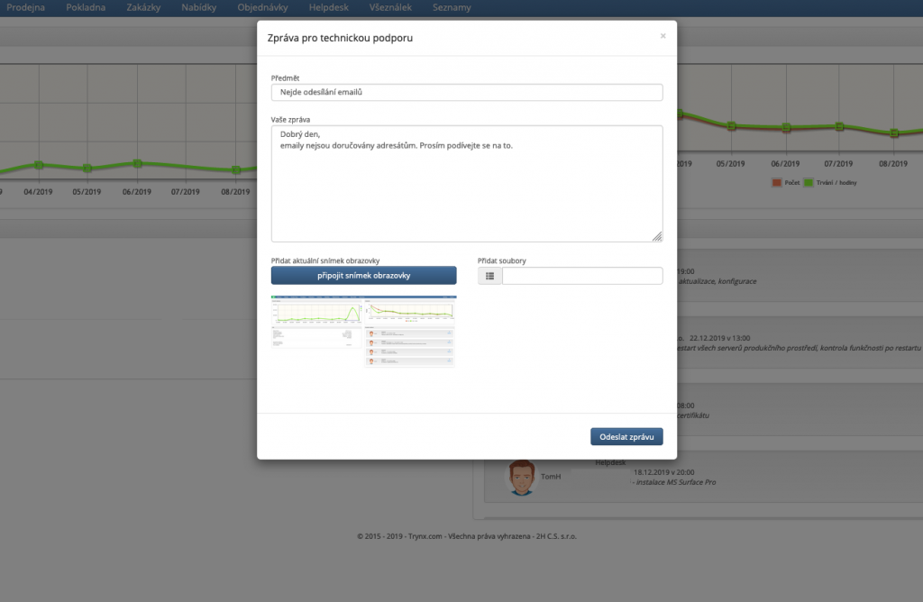 Do formuláře pak prosím co nejpodrobněji popište váš problém či požadavek. Můžete nechat připojit kopii obrazovky (kliknutím na tlačítko "připojit snímek obrazovky") a také až tři další soubory, které mohou obsahovat informace k požadavku.