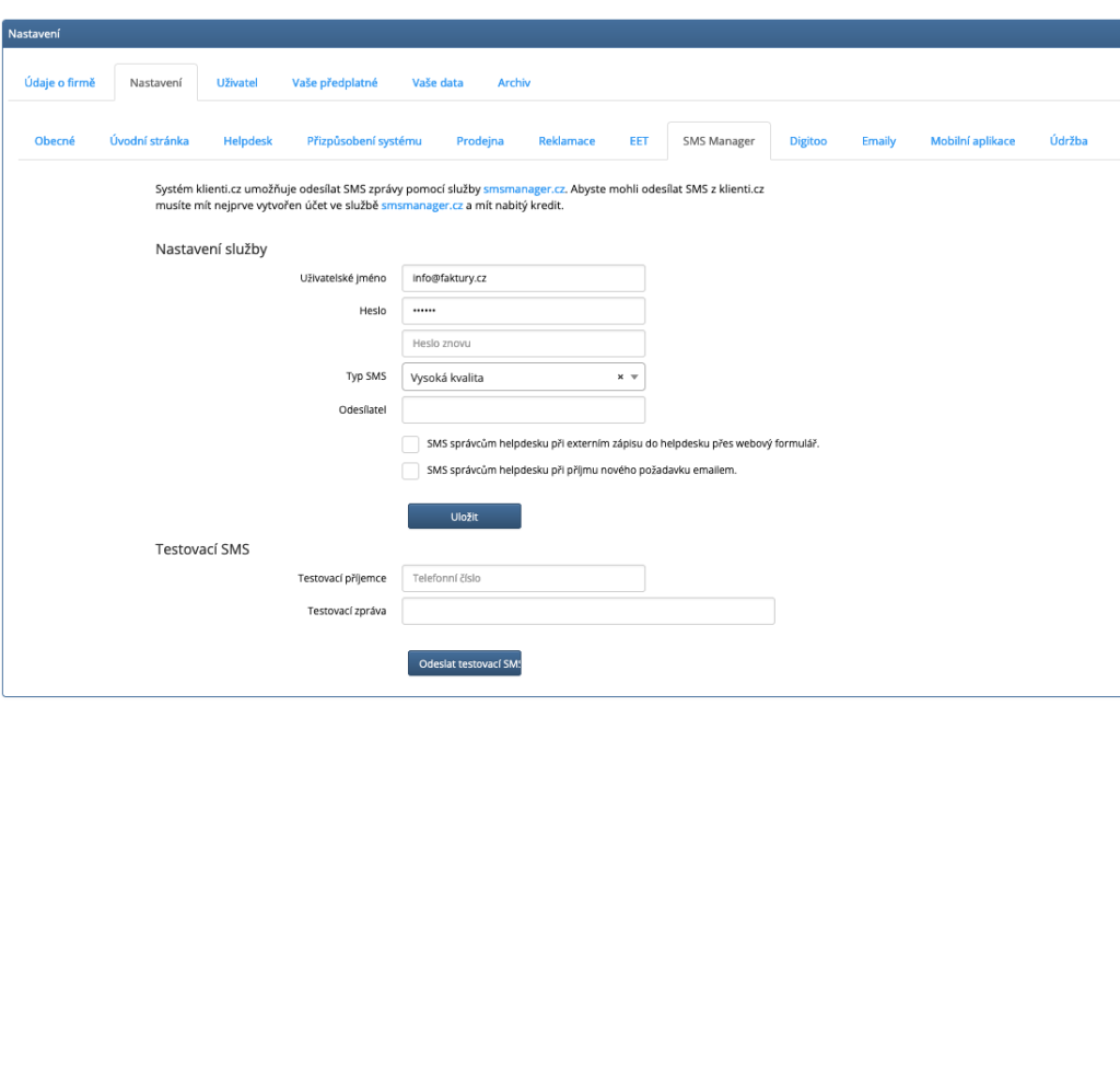 Kliknutím na tlačítko „Odeslat testovací SMS“ provedete odeslání SMS na zadané telefonní číslo. Tím ověříte správnost nastavení služby.