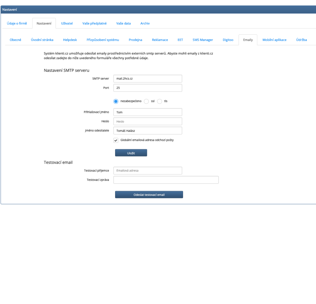 Systém Trynx umožňuje odesílat emaily prostřednictvím externích SMTP serverů. Abyste mohli emaily z klienti.cz odesílat je potřeba vyplnit všechny potřebné údaje pro nastavení SMTP serveru. Všechny údaje zjistíte od svého poskytovatele emailových služeb. Případně můžete zkopírovat nastavení ze svého emailového programu (Outlook, Thunderbird apod.)