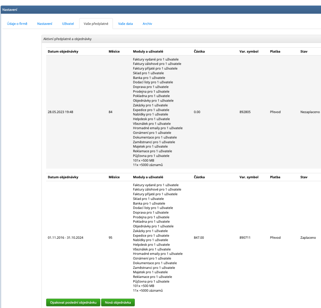 Pokud jste administrátorem firmy, můžete zde objednat předplatné služby Trynx na další období. Je zde také zobrazena historie předchozích objednávek. Můžete jednoduše zopakovat poslední objednávku.
