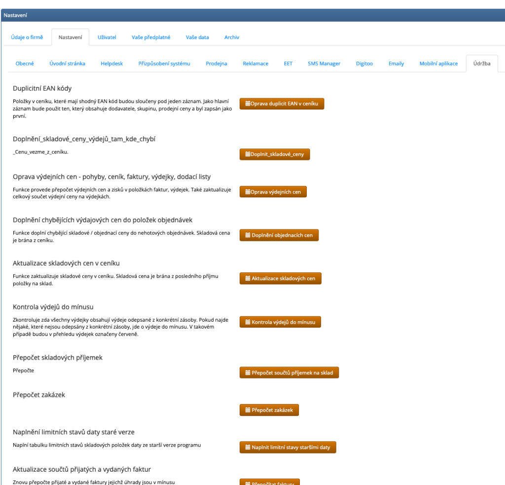 Funkce zaktualizuje skladové ceny v ceníku. Skladová cena je brána z posledního příjmu položky na sklad.