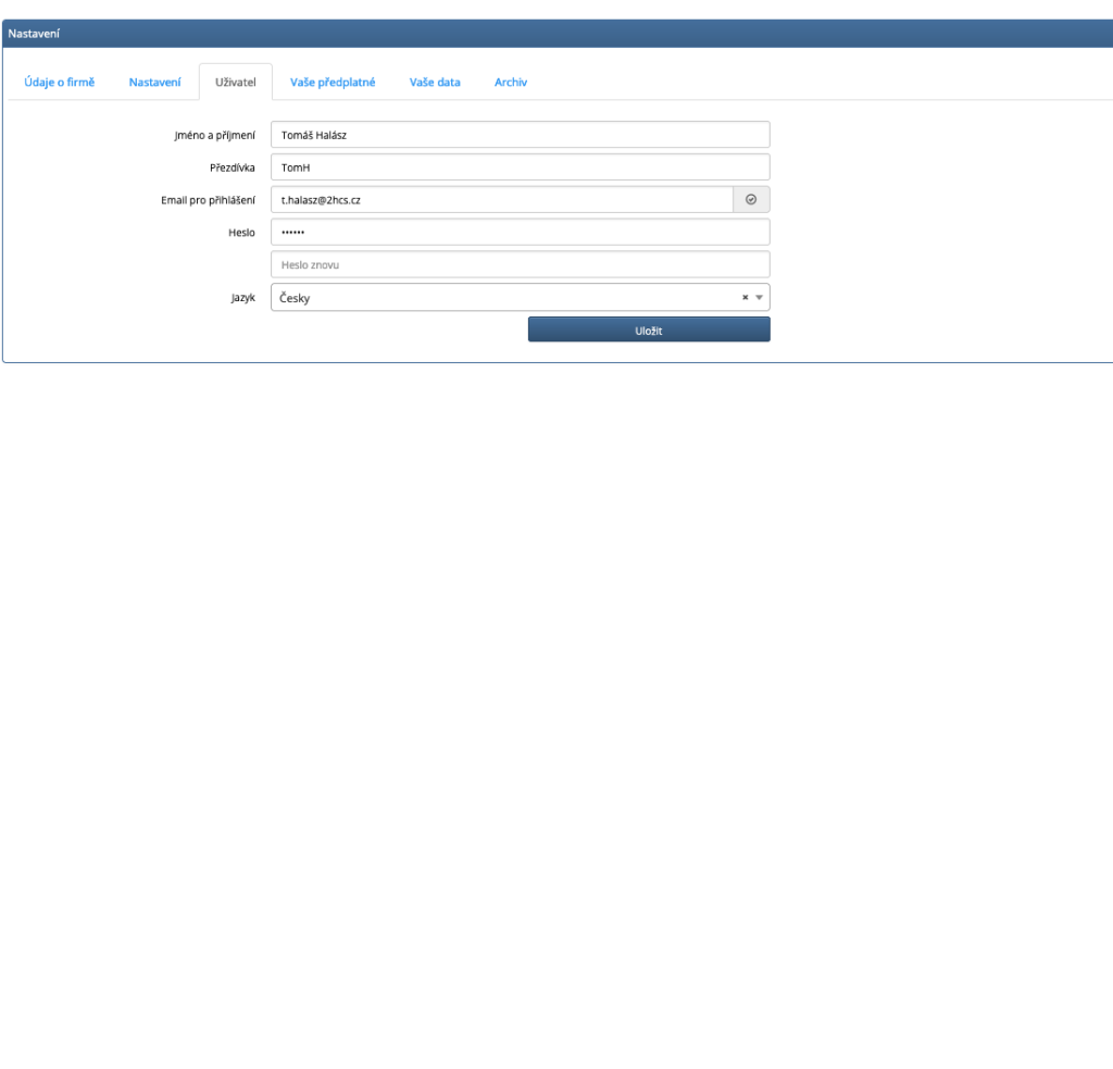 Zde jsou základní údaje uživatele jako je jméno a příjmení, přezdívka, přihlašovací email, heslo a jazyk. Jde pouze o základní údaje. Podrobné nastavení najdete v nabídce „Seznamy -> uživatelé“.
