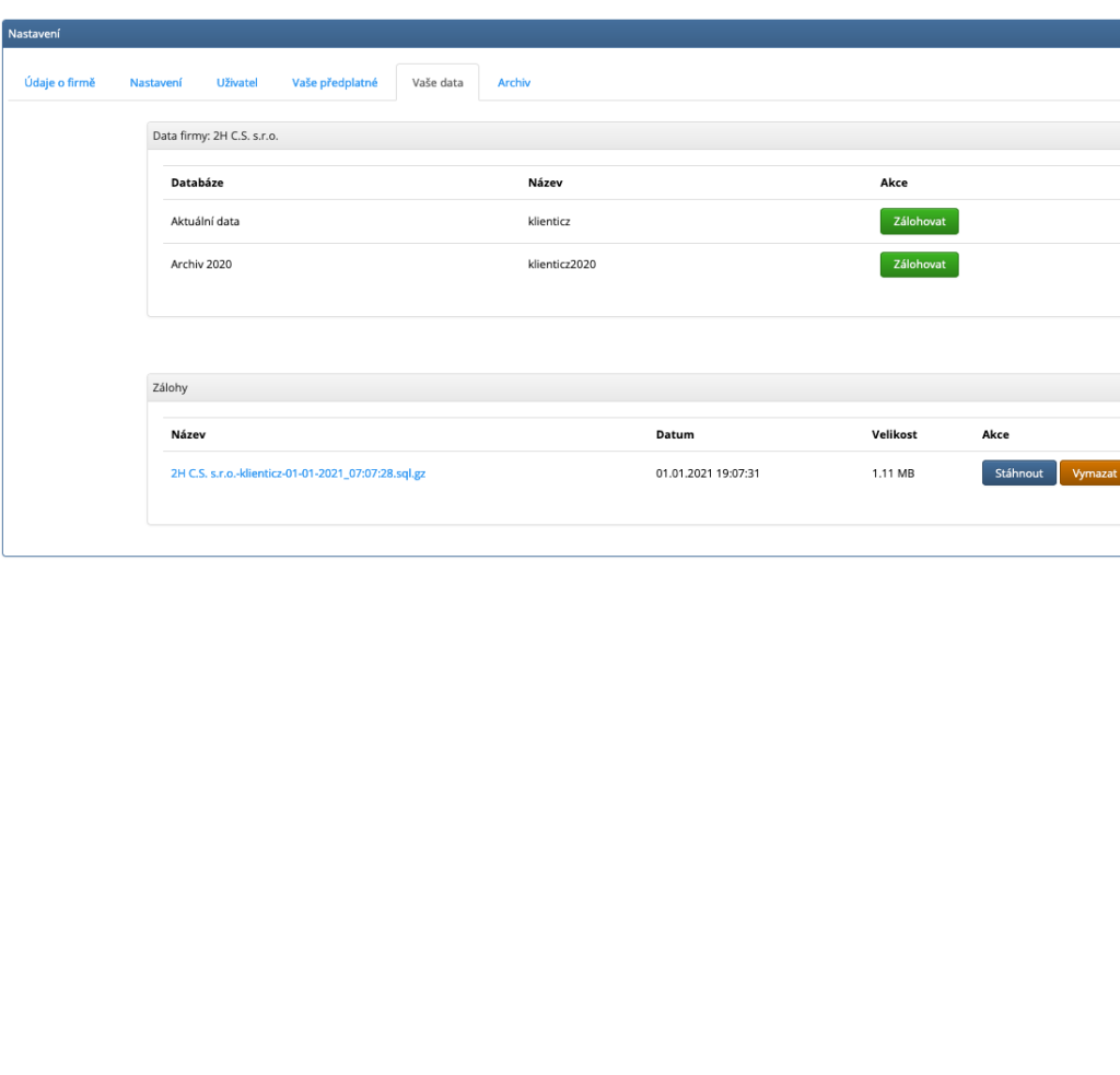 Na této záložce lze ručně vytvořit zálohu dat. V první tabulce vidíte aktivní databáze firmy. Typicky jsou to aktuální data a archiv. U každé databáze je tlačítko „Zálohovat“ pro vytvoření zálohy. V druhé tabulce je pak seznam všech záloh. Můžete je stáhnout k sobě do počítače, nebo vymazat ze serveru.