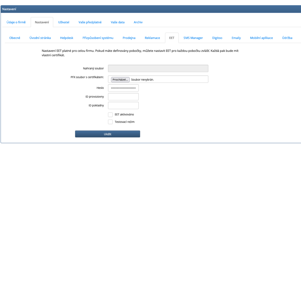 Nastavení EET platné pro celou firmu. Pokud máte definovány pobočky, můžete nastavit EET pro každou pobočku zvlášť. Každá pak bude mít vlastní certifikát.