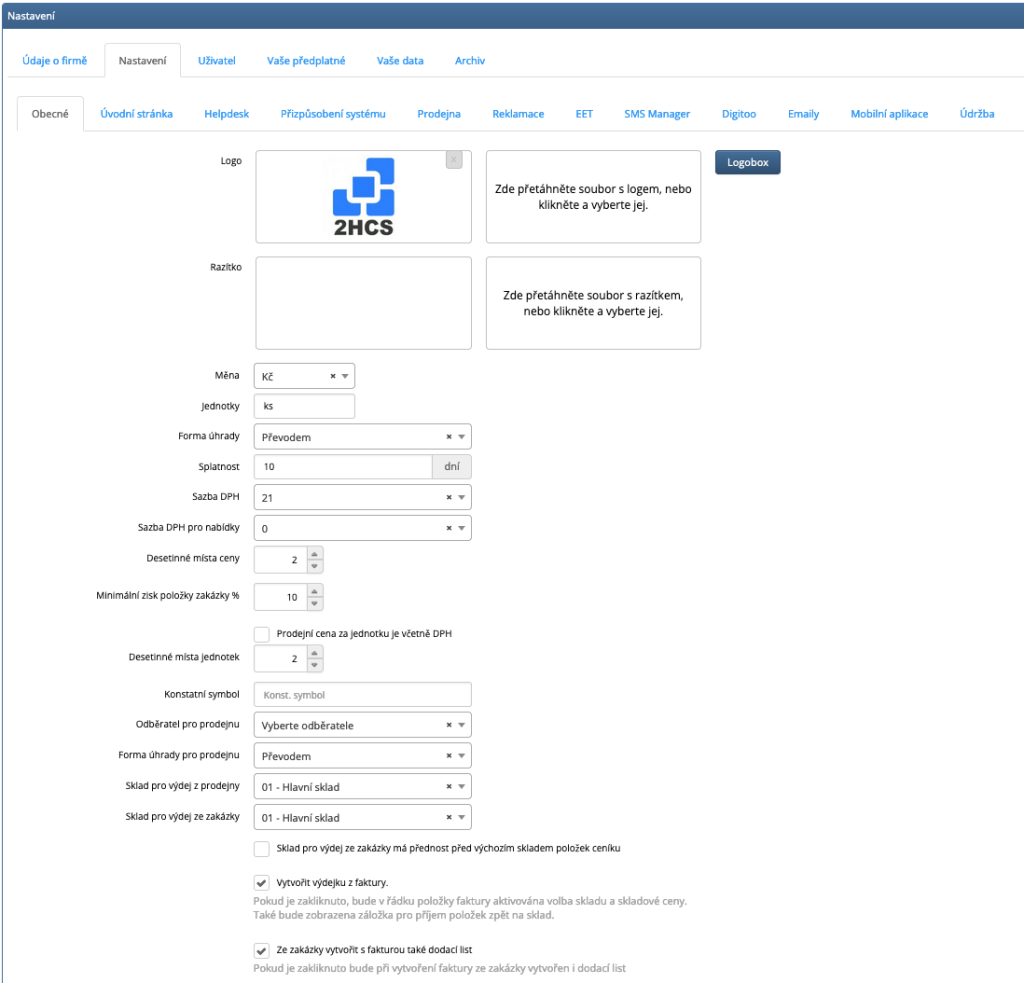 Zde můžete nastavit logo své firmy, které se bude tisknout na vystavovaných dokladech. Buď přetáhněte soubor s logem na obdélník s textem „Zde přetáhněte soubor s logem, nebo klikněte a vyberte jej“. Nebo můžete na tento obdélník kliknout a soubor s logem vybrat pomocí výběru souborů tak jak to umožňuje operační systém vašeho počítače. Podporované formáty jsou bmp, gif, jpg, png . Maximální povolená velikost je 4MB.