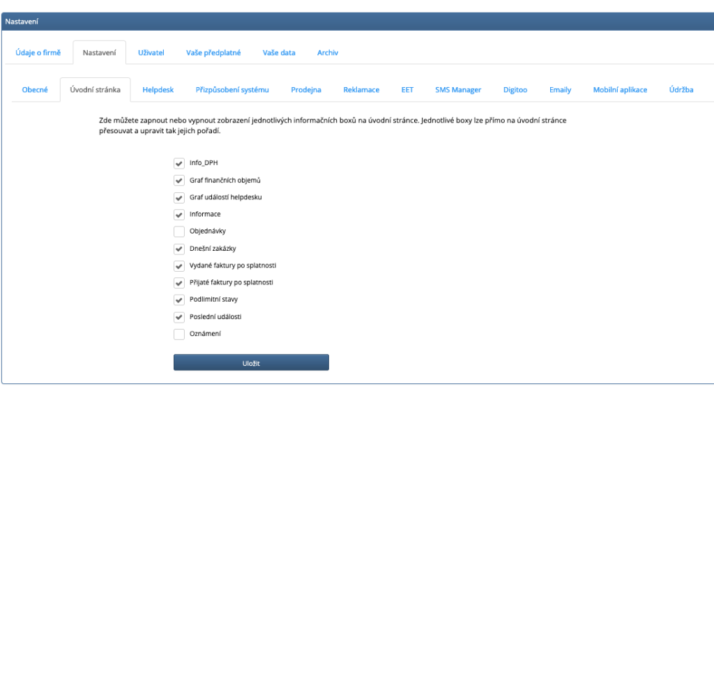 Zde můžete zapnout nebo vypnout zobrazení jednotlivých informačních boxů na úvodní stránce. Jednotlivé boxy lze přímo na úvodní stránce přesouvat a upravit tak jejich pořadí.