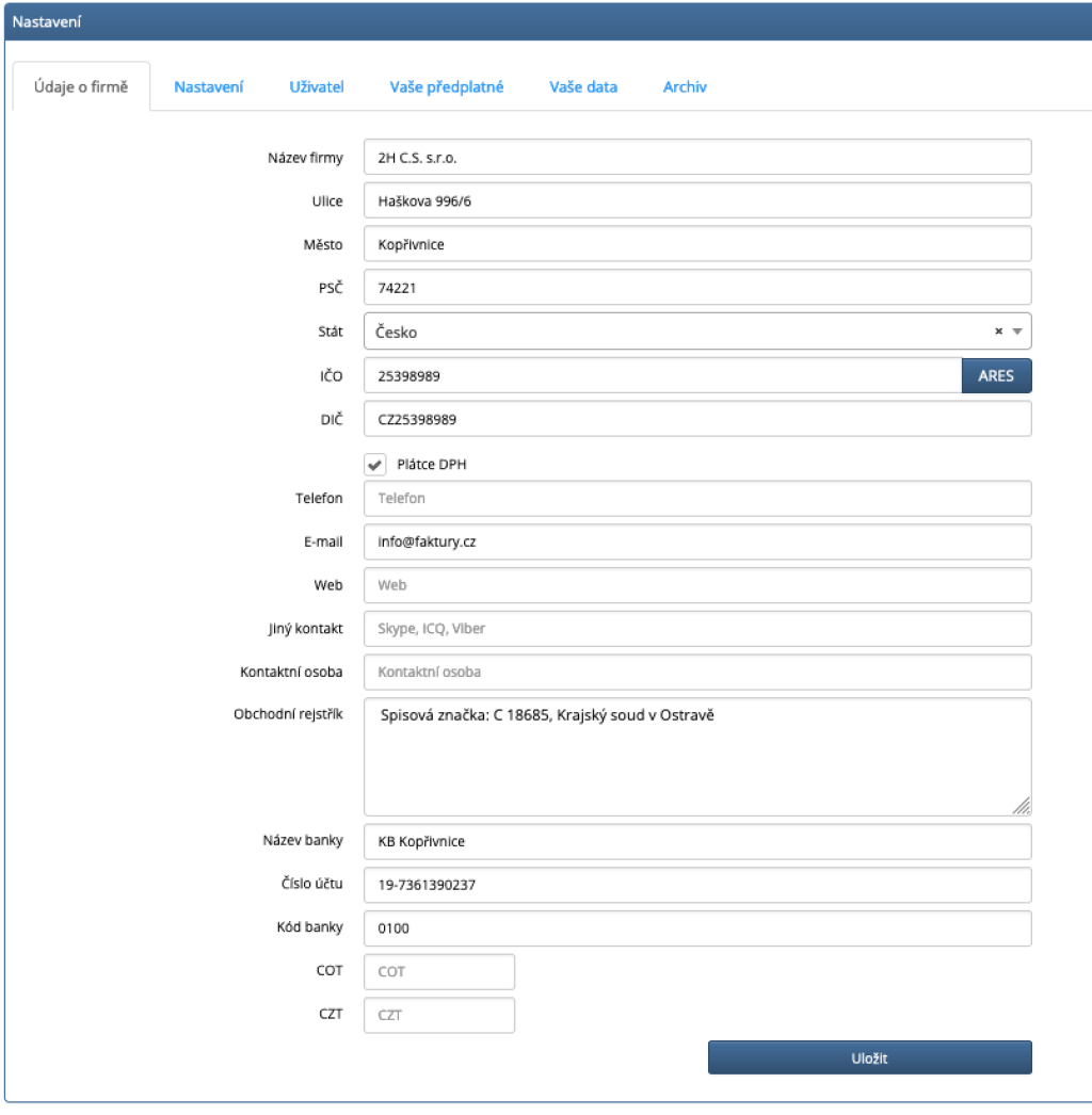 Zde jsou základní údaje o vaší firmě. Většina z nich je povinná např. IČ, název a sídlo firmy, zápis v obchodním rejstříku. Nejjednodušší způsob zápisu je, když nejprve doplníte IČ a pak klikněte na tlačítko "ARES". Údaje o firmě budou automaticky načteny z registru ekonomických subjektů ARES.  Zkontrolujte, jestli máte správně nastaveno pole "plátce DPH". Můžete uvést také své kontaktní údaje jako je telefon, email, web a jméno kontaktní osoby. Pokud zpracováváte odpady, jsou důležité údaje COT a CZT.