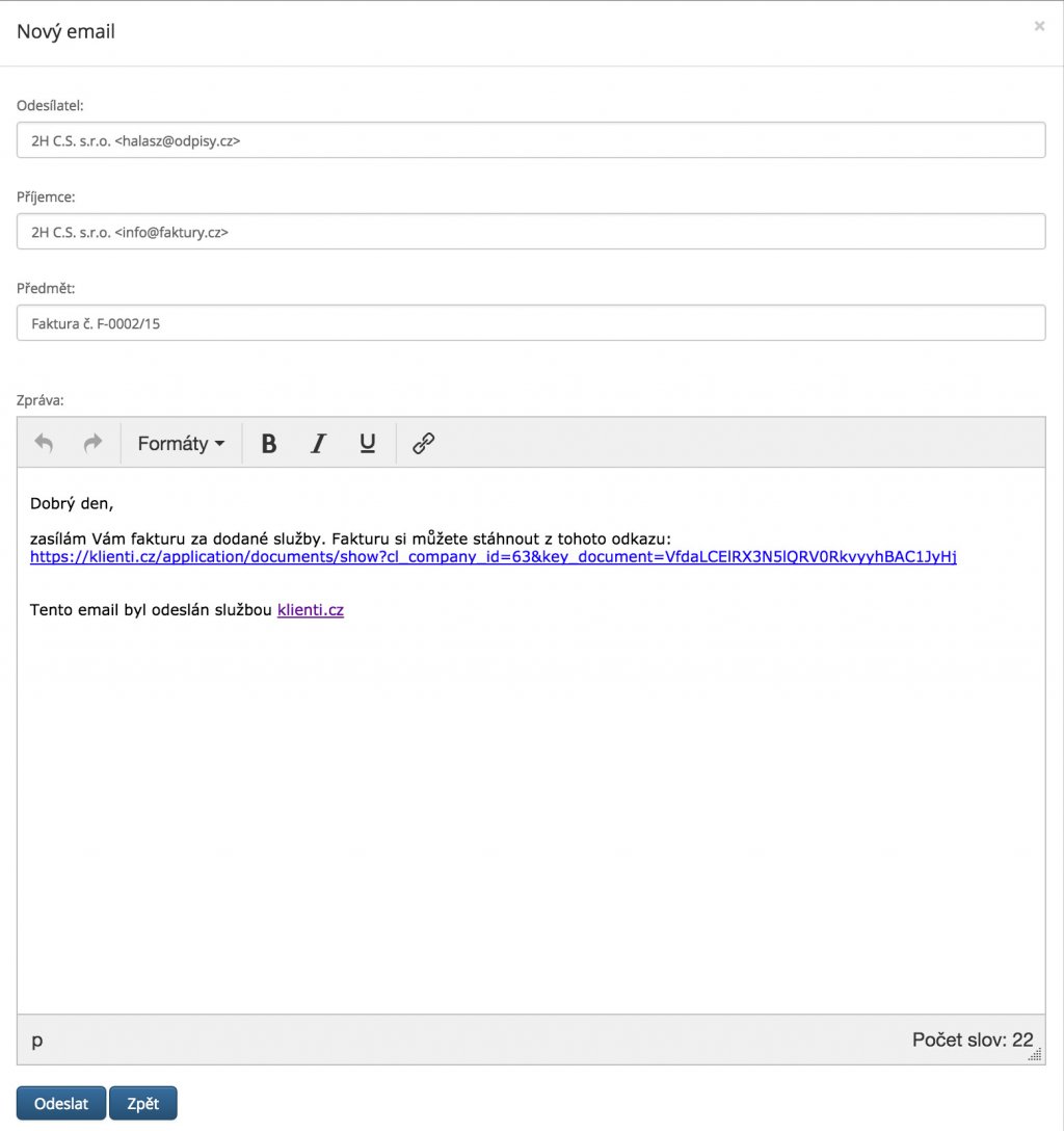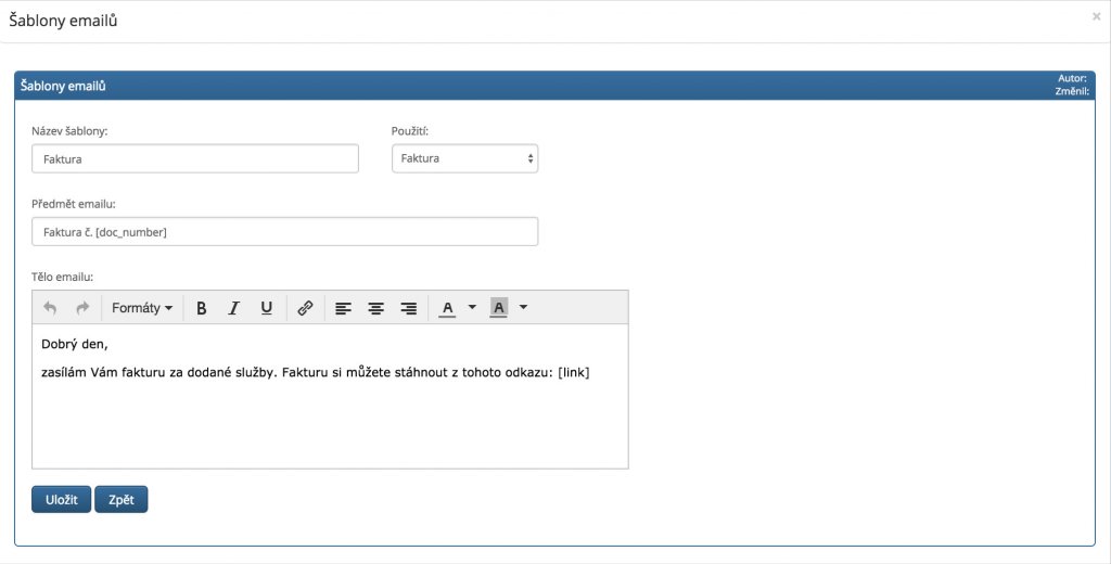 Předmět a tělo emailu jsou automaticky vytvořeny podle šablony emailu pro faktury. Můžete je upravit a doplnit podle potřeby. Samotnou šablonu emailu si můžete upravit podle potřeby v "seznamy - ostatní - šablony emailů".