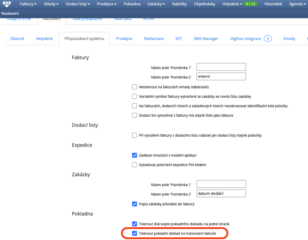 - zkontrolujte zda je v kartě faktury zakliknuta volba "Tisknout pokladní doklad" (výchozí nastavení pro tuto volbu najdete v nastavení programu -> přizpůsobení systému")