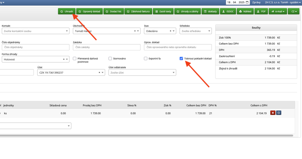 - klikněte na tlačítko "uhradit" v horní liště faktury. Tím se provede úhrada faktury a vytvoří se pokladní doklad