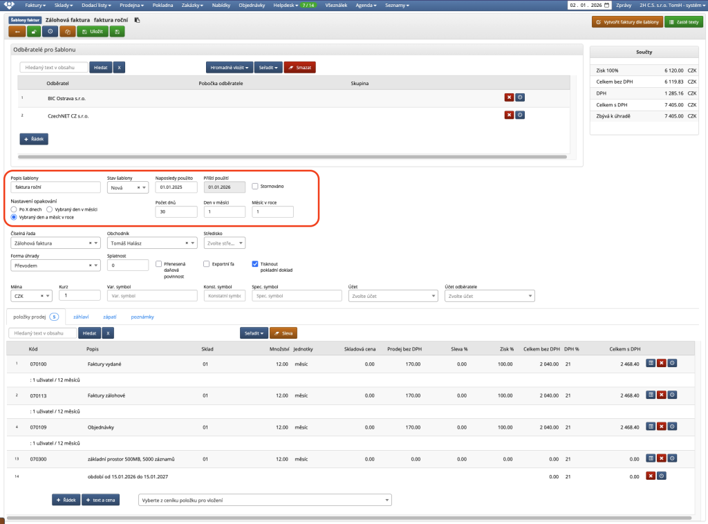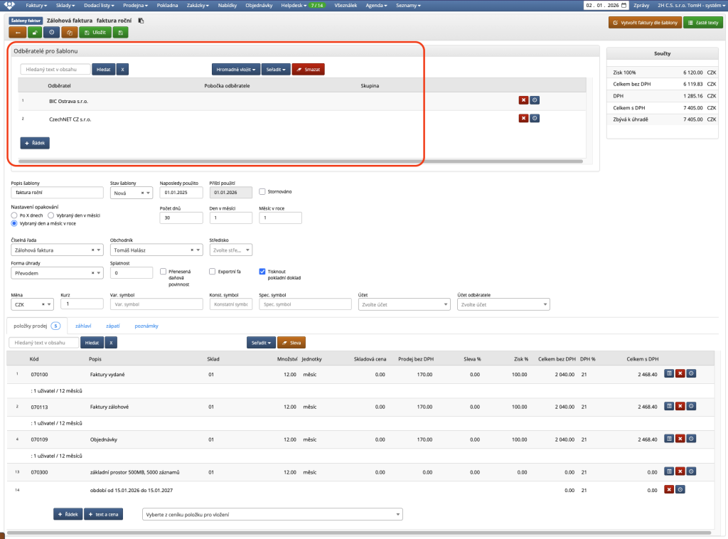 - šablona může mít jednoho nebo třeba 20 odběratelů. Jedním kliknutím pak z této šablony vytvoříte 20 faktur pro dvacet vybraných odběratelů