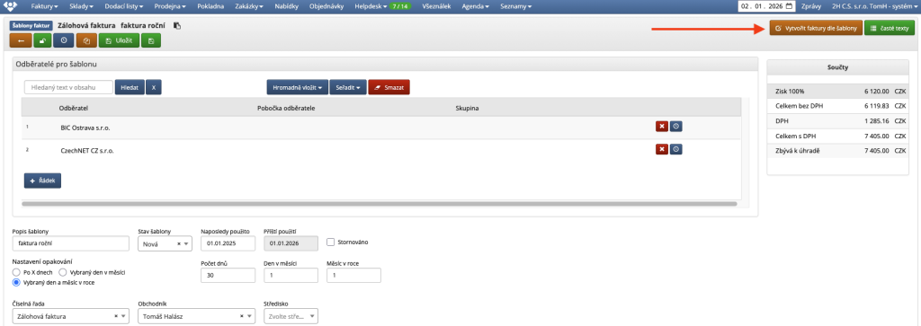 - faktury z šablony vytvoříte jednoduše kliknutím na tlačítko "vytvořit faktury dle šablony"