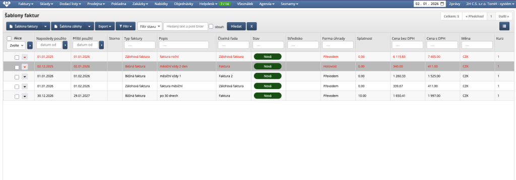 - seznam šablon je ve výchozím stavu seřazen podle data příštího použití šablony. Hned při otevření modulu "šablony" tak vidíte, které šablony jsou "na řadě" a čekají na vystavení faktury.