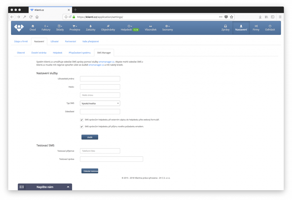 - v klienti.cz v nastavení doplnit údaje pro přístup do smsmanager.cz