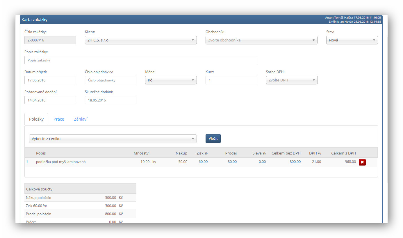Každý, kdo podniká potřebuje přehled o rozpracovaných zakázkách. Do zakázky můžete vložit jak položky z ceníku tak